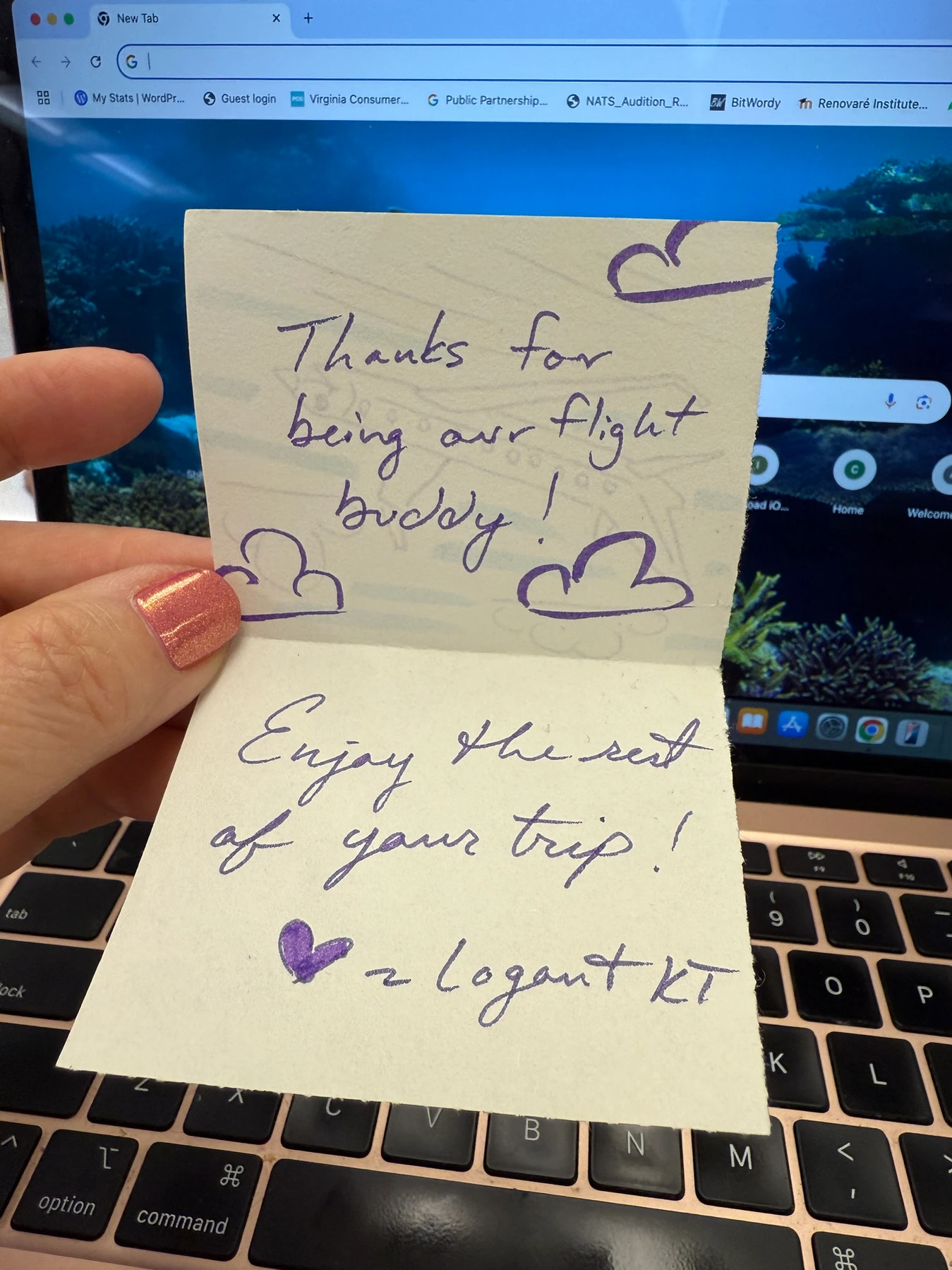 “Thanks for being our flight buddy. Enjoy the rest of your trip. ♥ Logan and KT.”